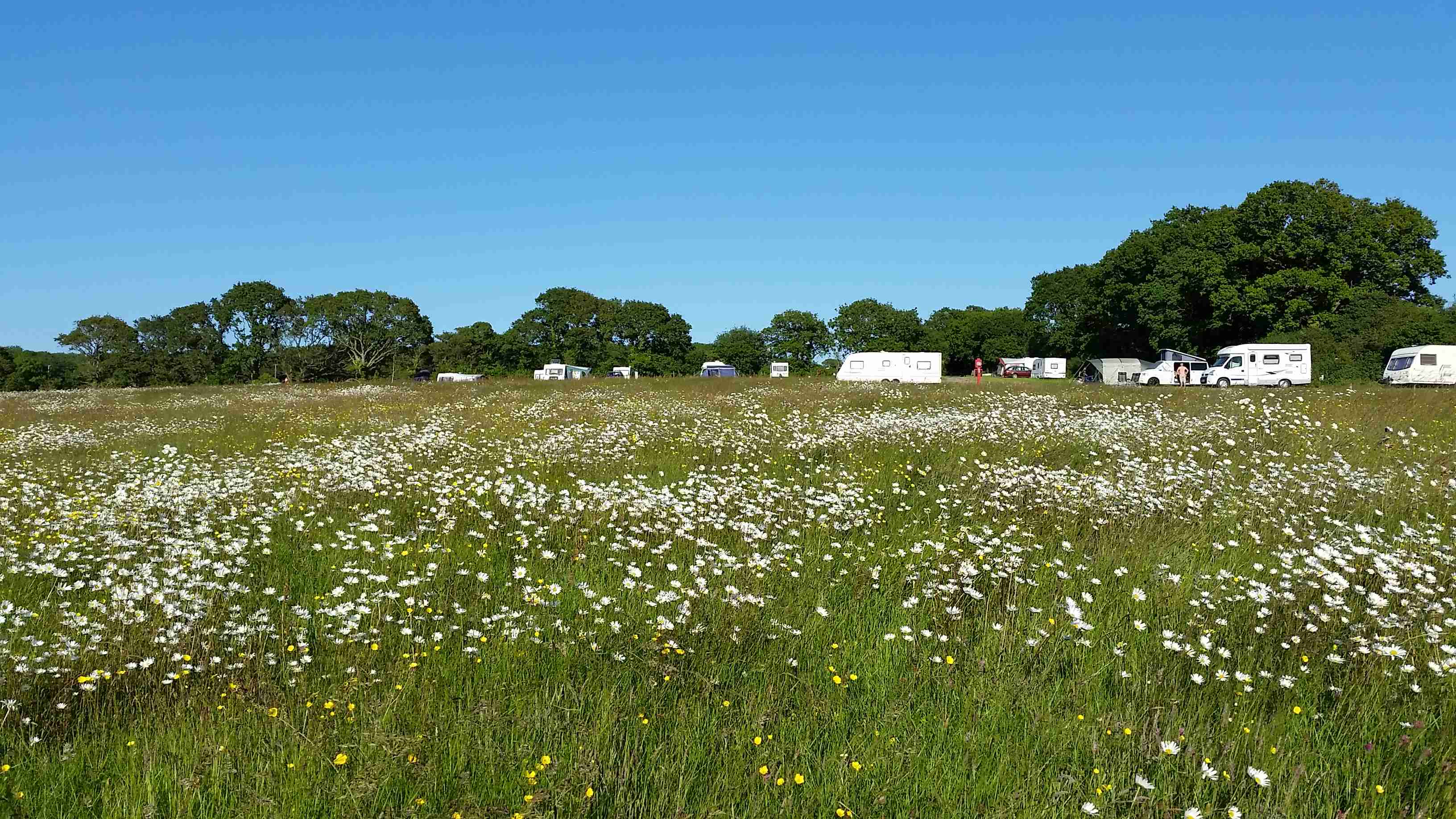 The camping field is 9 acres of unspoilt meadow, tree lined and flanked to the north by ancient coppice. From the top, the field is gently sloping and levels out in the middle.
